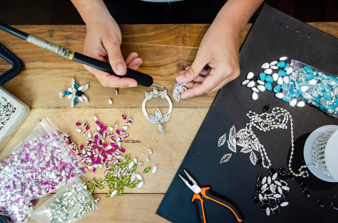 Cada pieza de bijouterie es diseñada y fabricada por nuestro equipo. Es un trabajo muy artesanal que lleva mucho tiempo porque se suelda pieza por pieza y se pega piedra por piedra. Lo hacemos con mucho amor, dedicación y paciencia!