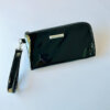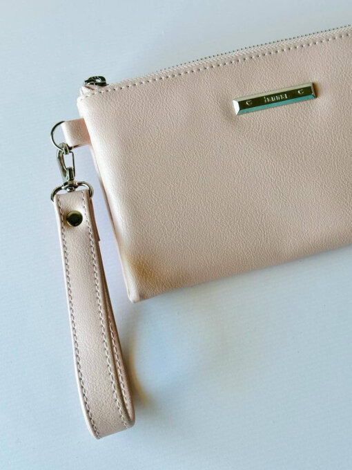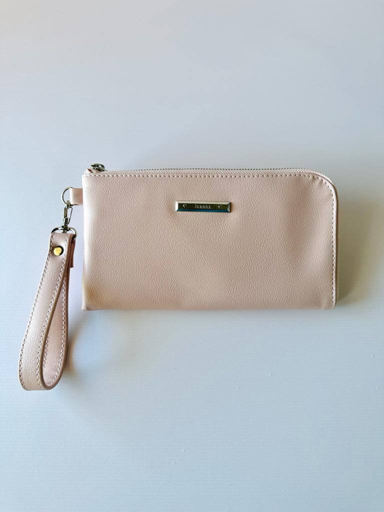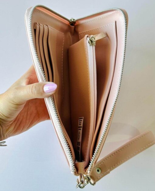 Tiene compartimentos internos para billetes y tarjetas y un cierre para monedas o papeles.