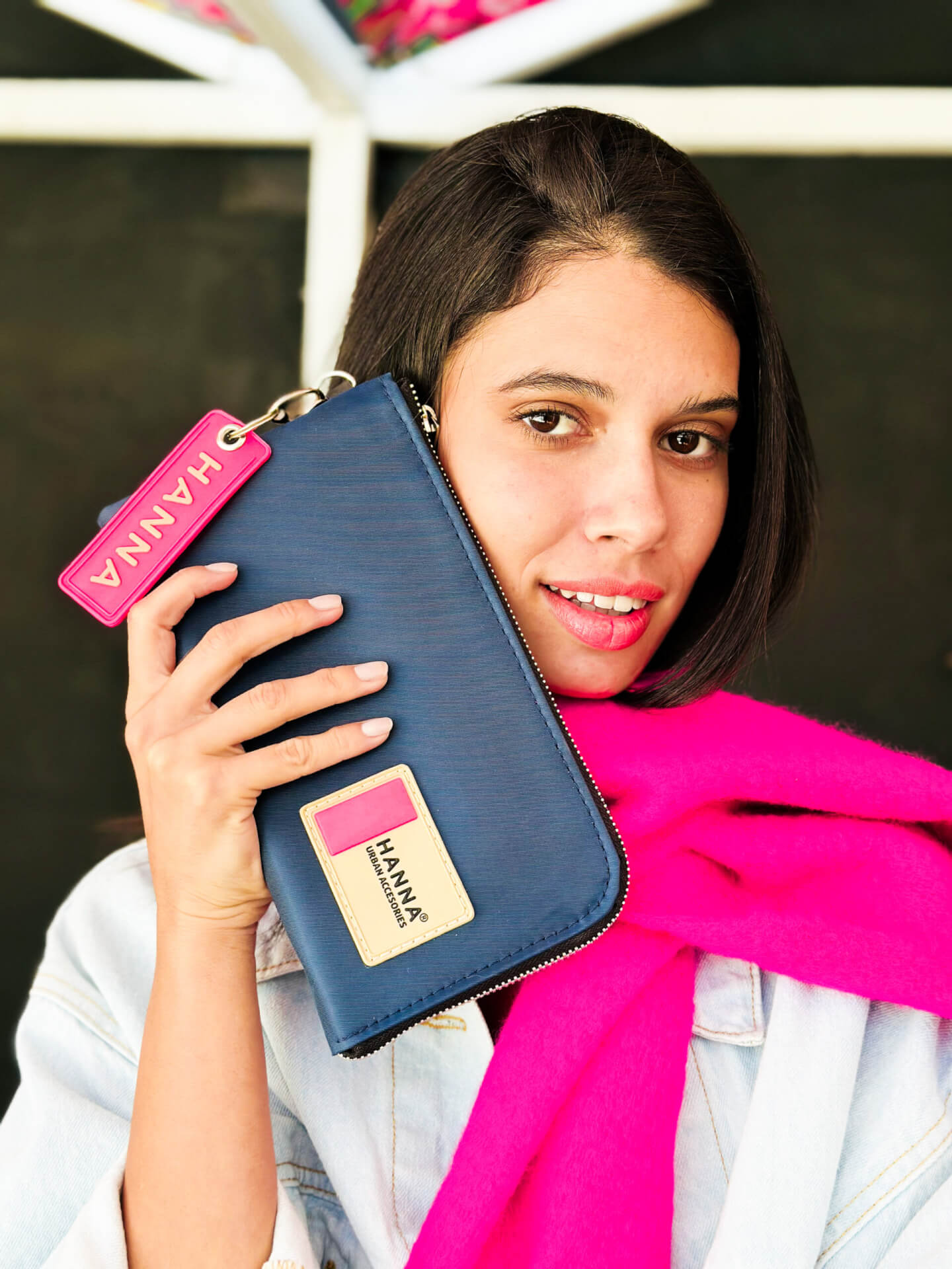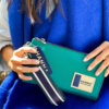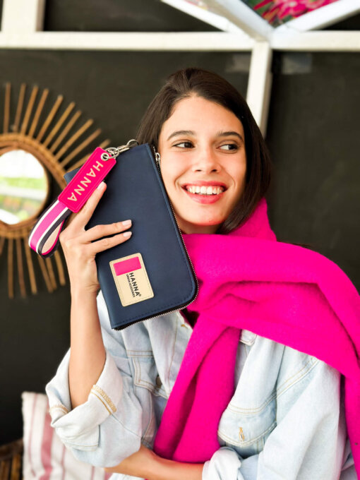 Se puede usar como sobre de mano y tiene asa desmontable, llavero y etiqueta de goma.