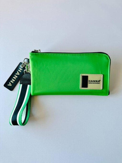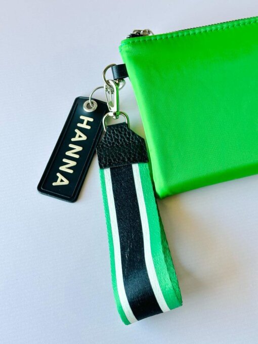 Se puede usar como sobre de mano y tiene asa desmontable, llavero y etiqueta de goma.