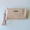 Tiene compartimentos internos para billetes, tarjetas y un cierre para monedas o papeles.