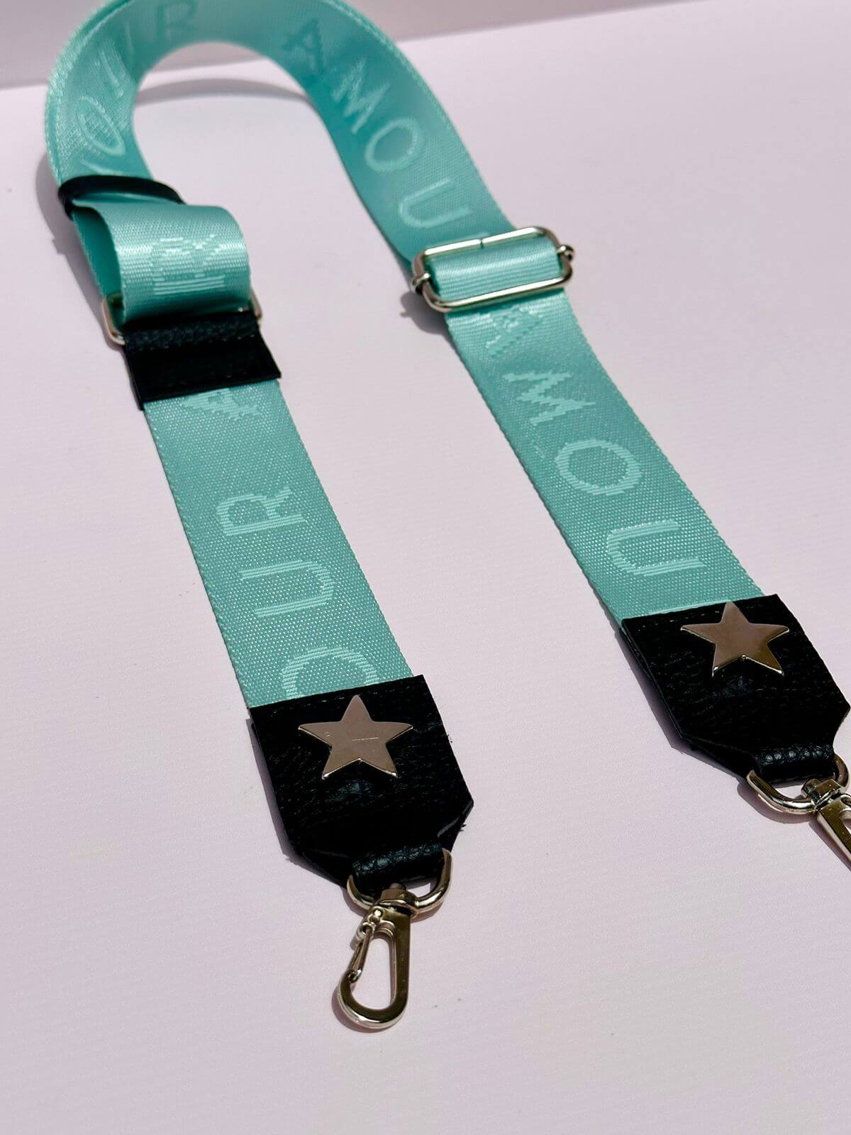 Regulable y con mosquetones metal, puntera de cuero con estrella.