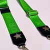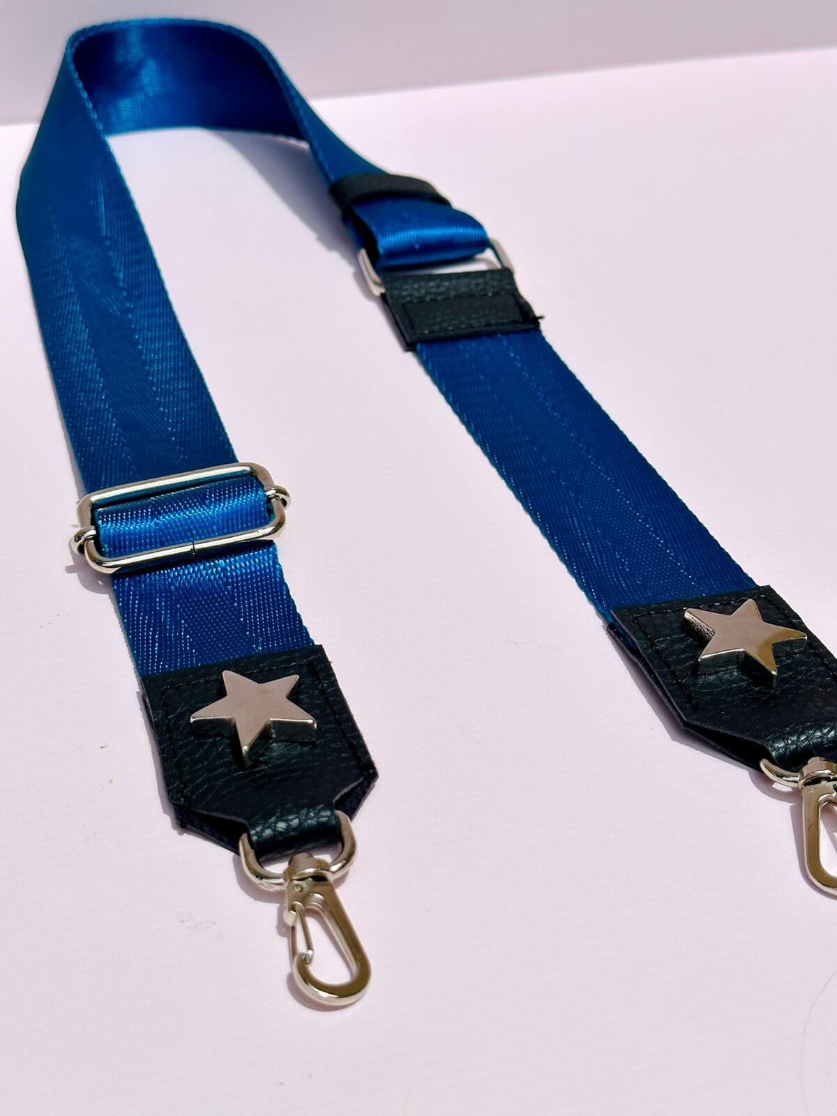 Regulable y con mosquetones metal, puntera de cuero con estrella.
