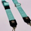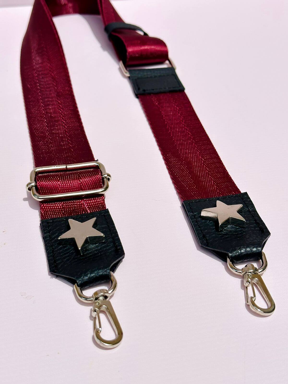 Regulable y con mosquetones metal, puntera de cuero con estrella.