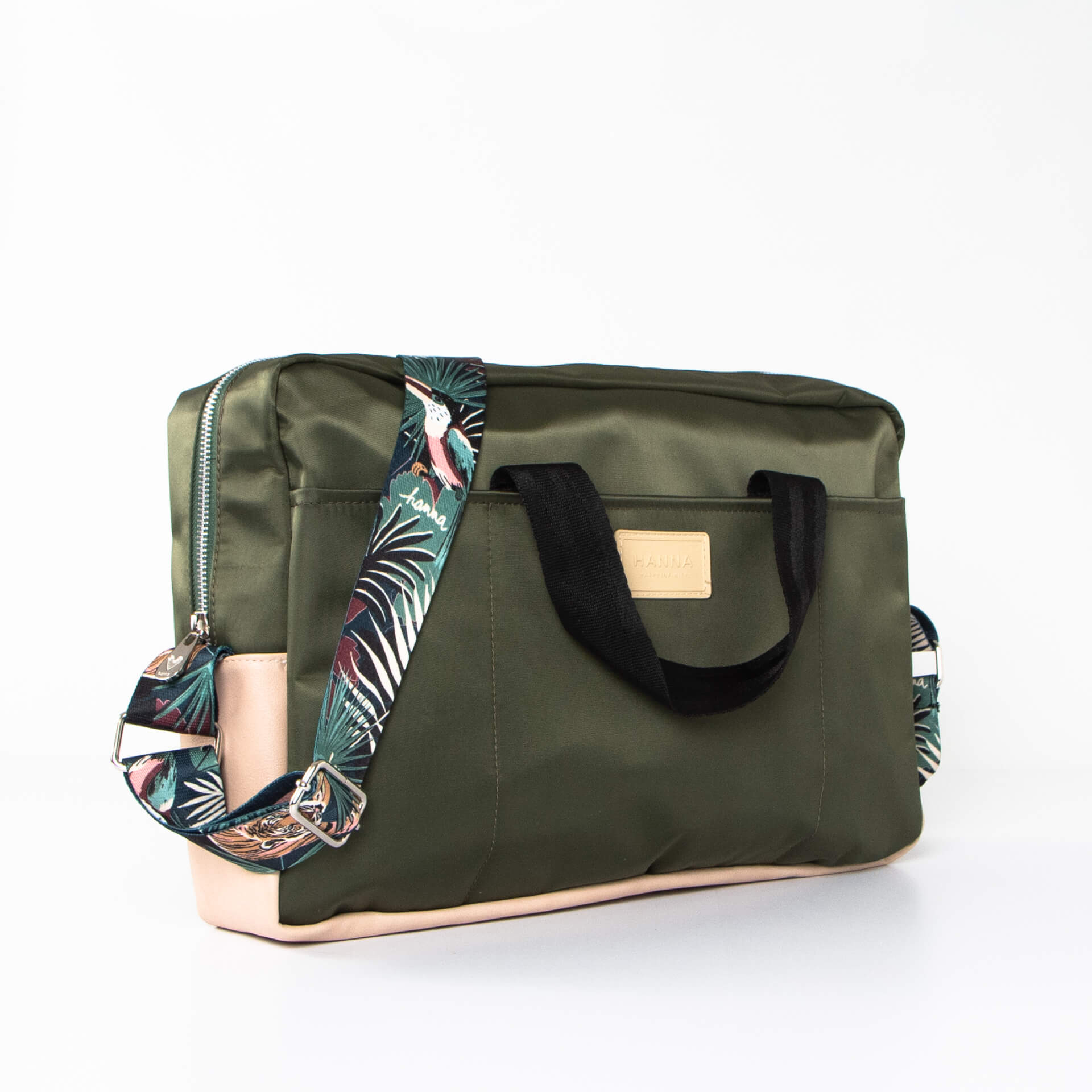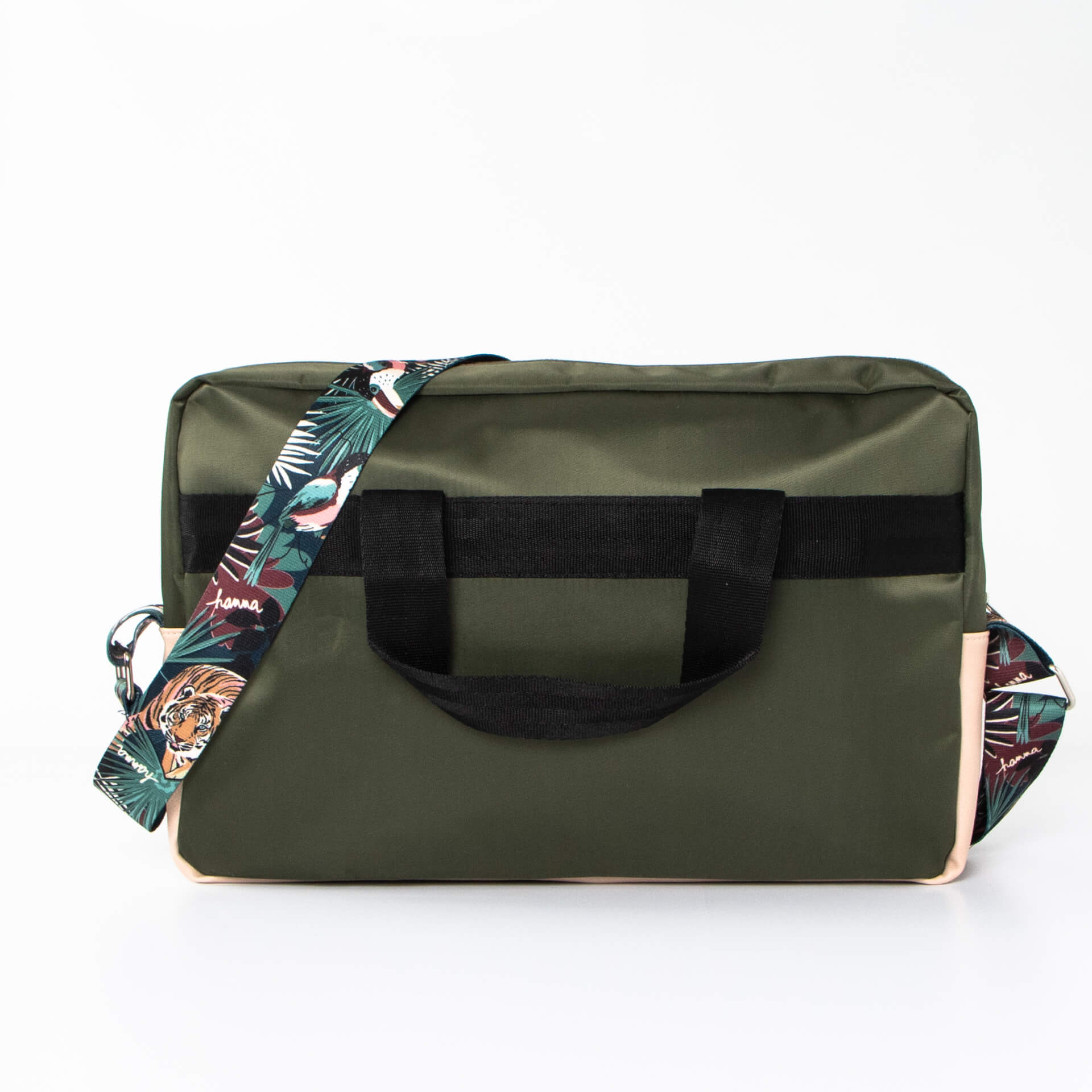 Maletín porta-notebook con manijas cortas y correa regulable estampada.