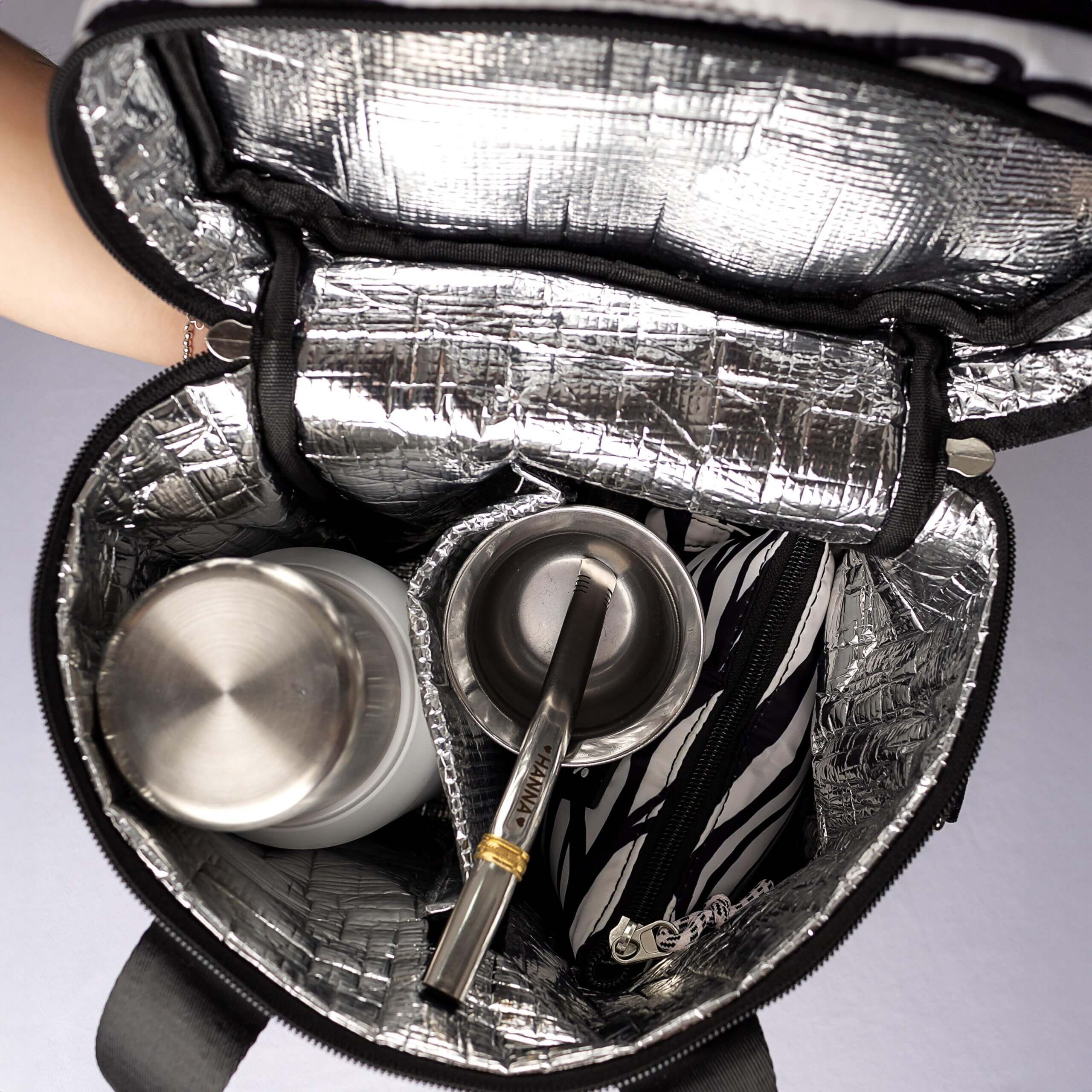 • Interior térmico: mantiene frío y calor, ideal para llevar el equipo de mate, bebidas y también alimentos frescos.