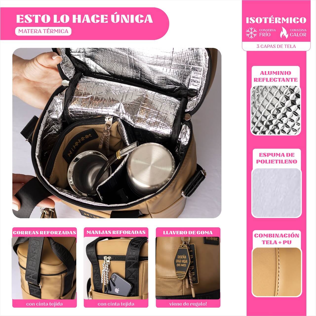 •Interior térmico: mantiene frío y calor, ideal para llevar el equipo de mate, bebidas y también alimentos frescos.