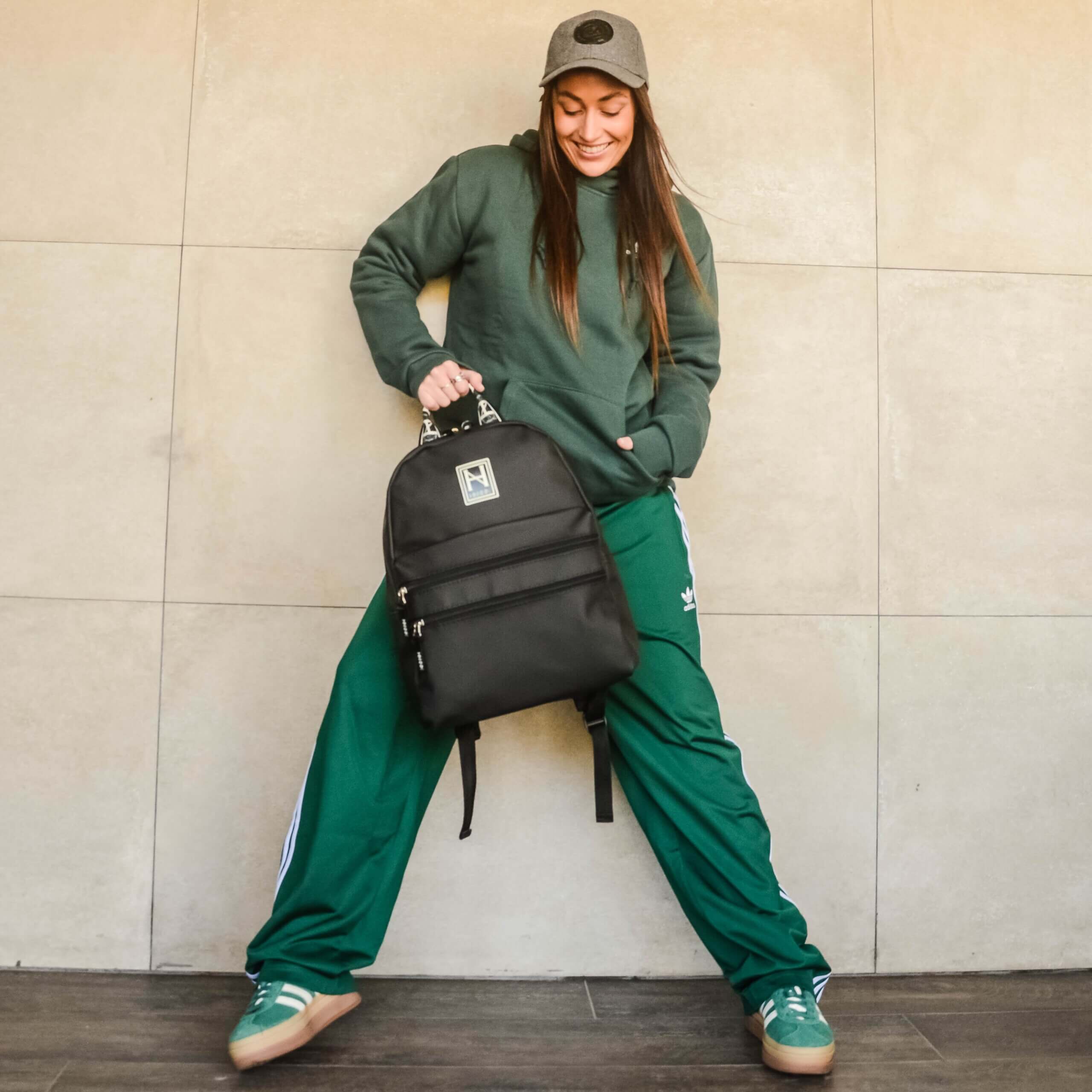Mochila lisa engomada de cordura con 1 división y bolsillo delantero con 2 cierres.