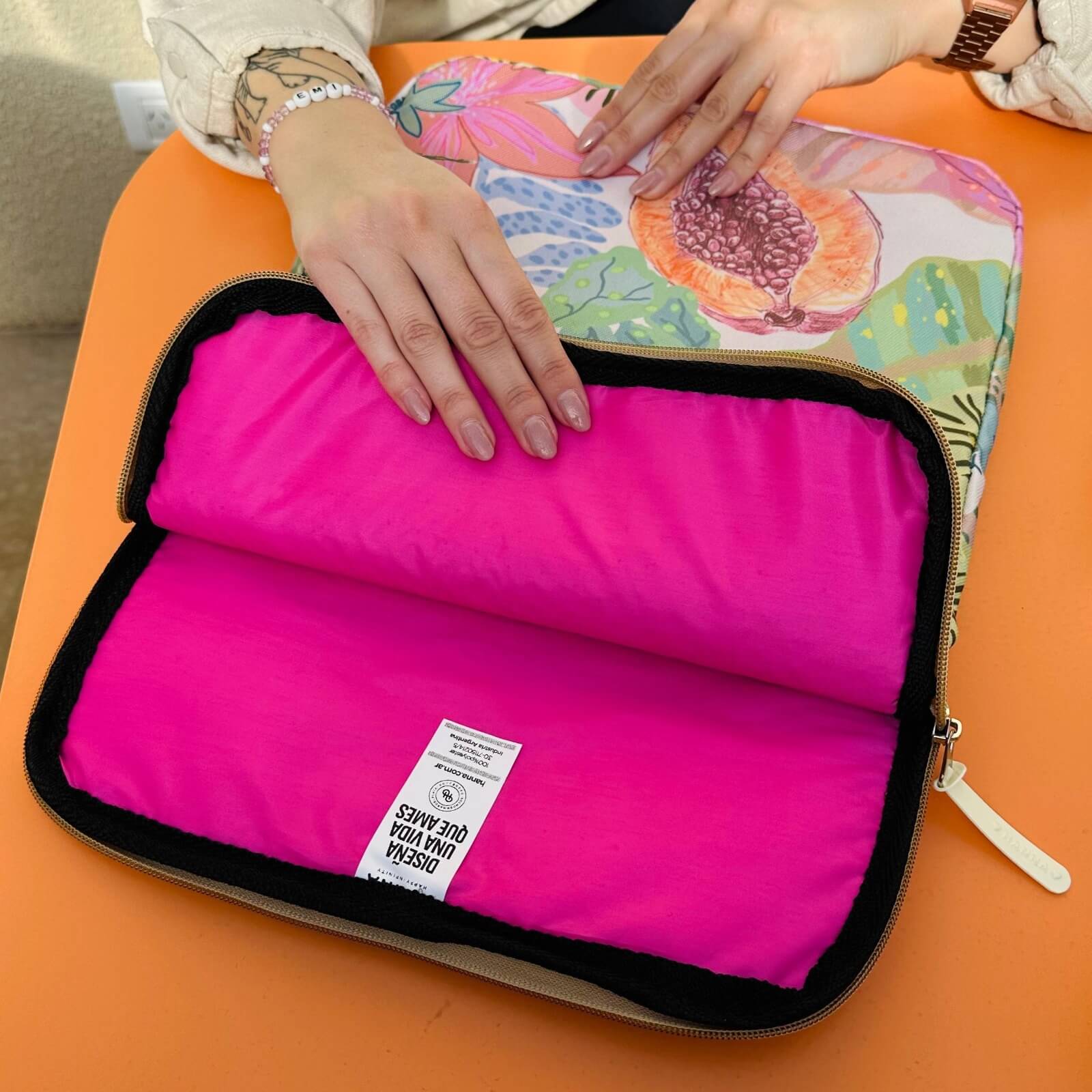 Posee bolsillo delantero e interior acolchonado y resistente.