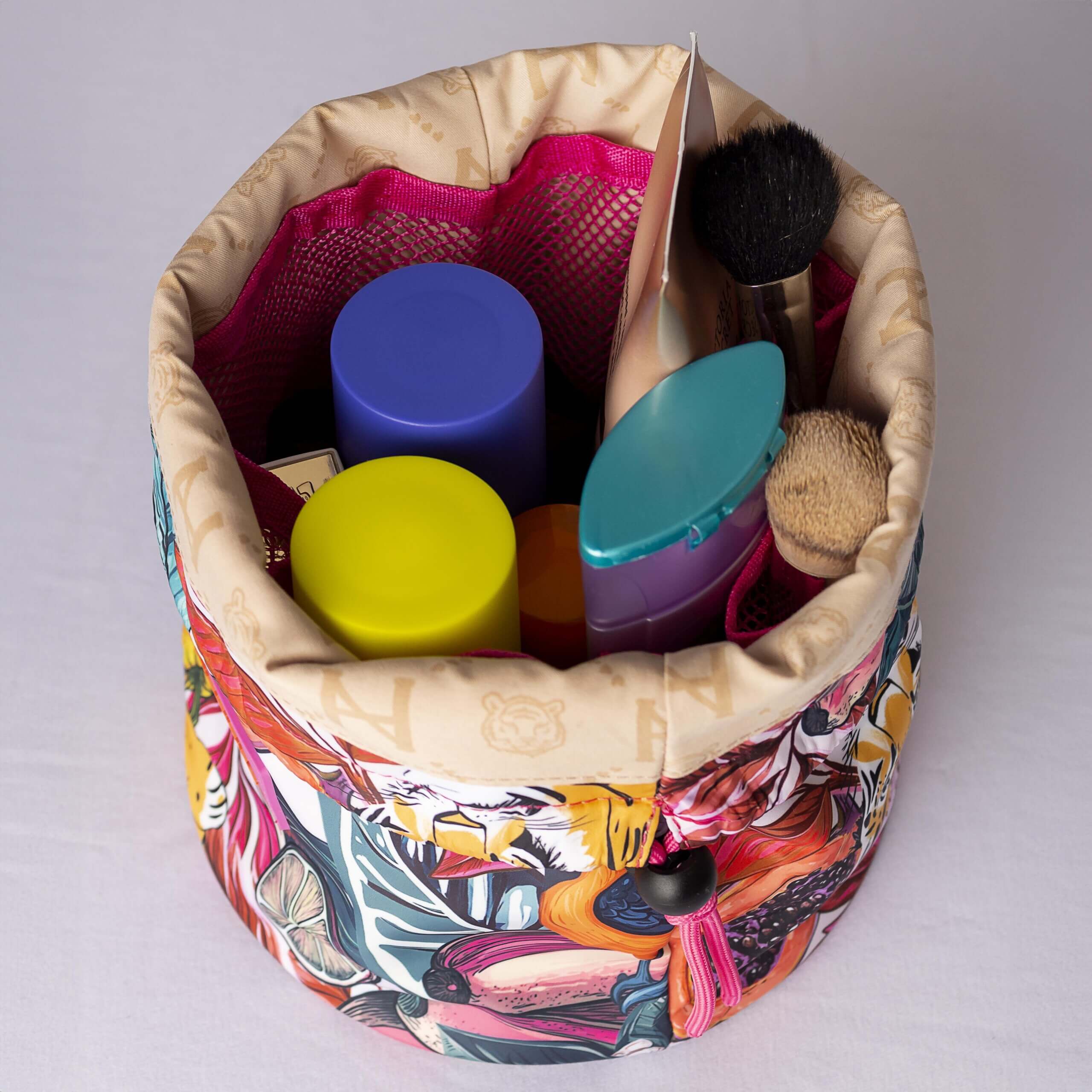•Varios bolsillos de red y elásticos internos para sujetar brochas, cremas y maquillaje de manera segura.