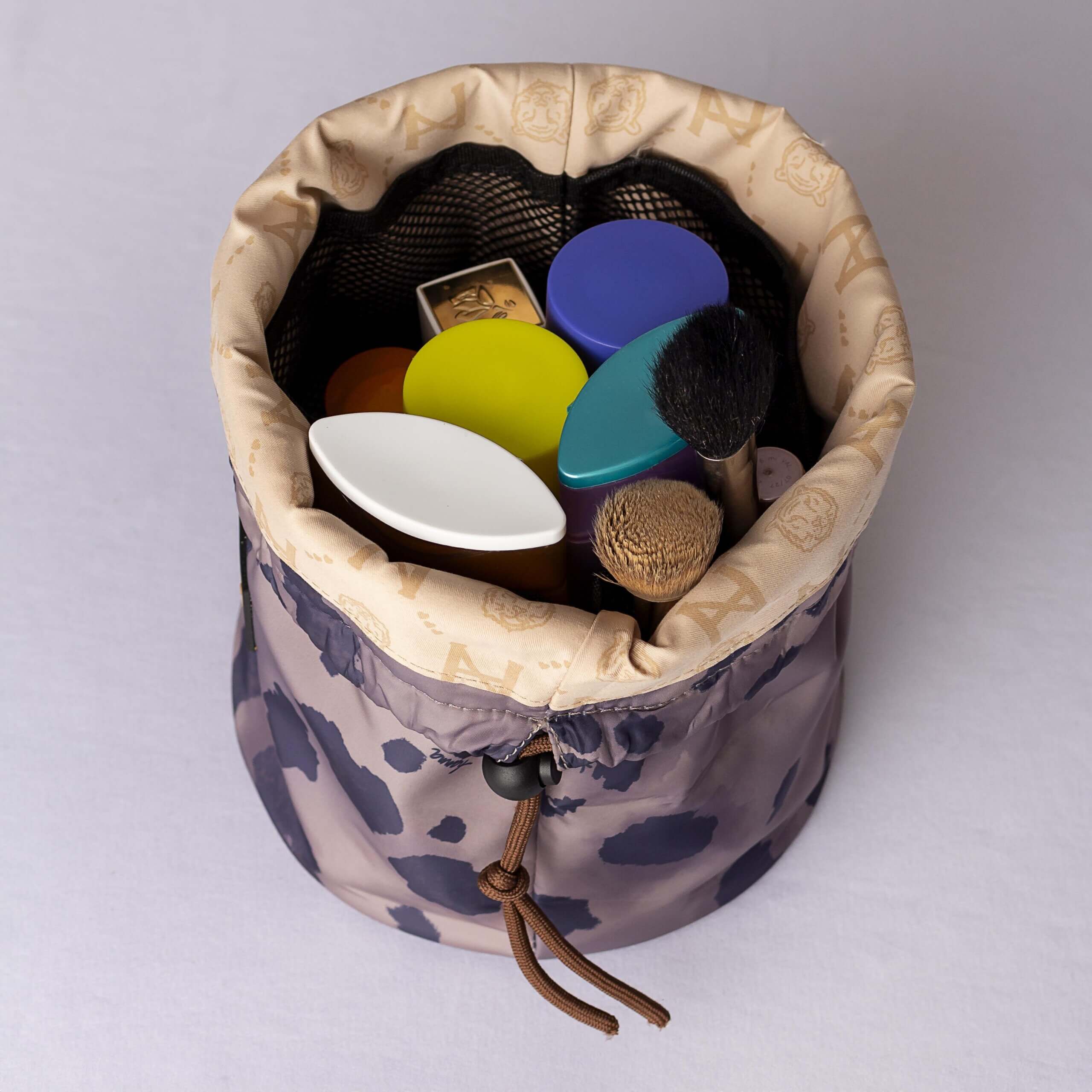 •Varios bolsillos de red y elásticos internos para sujetar brochas, cremas y maquillaje de manera segura.