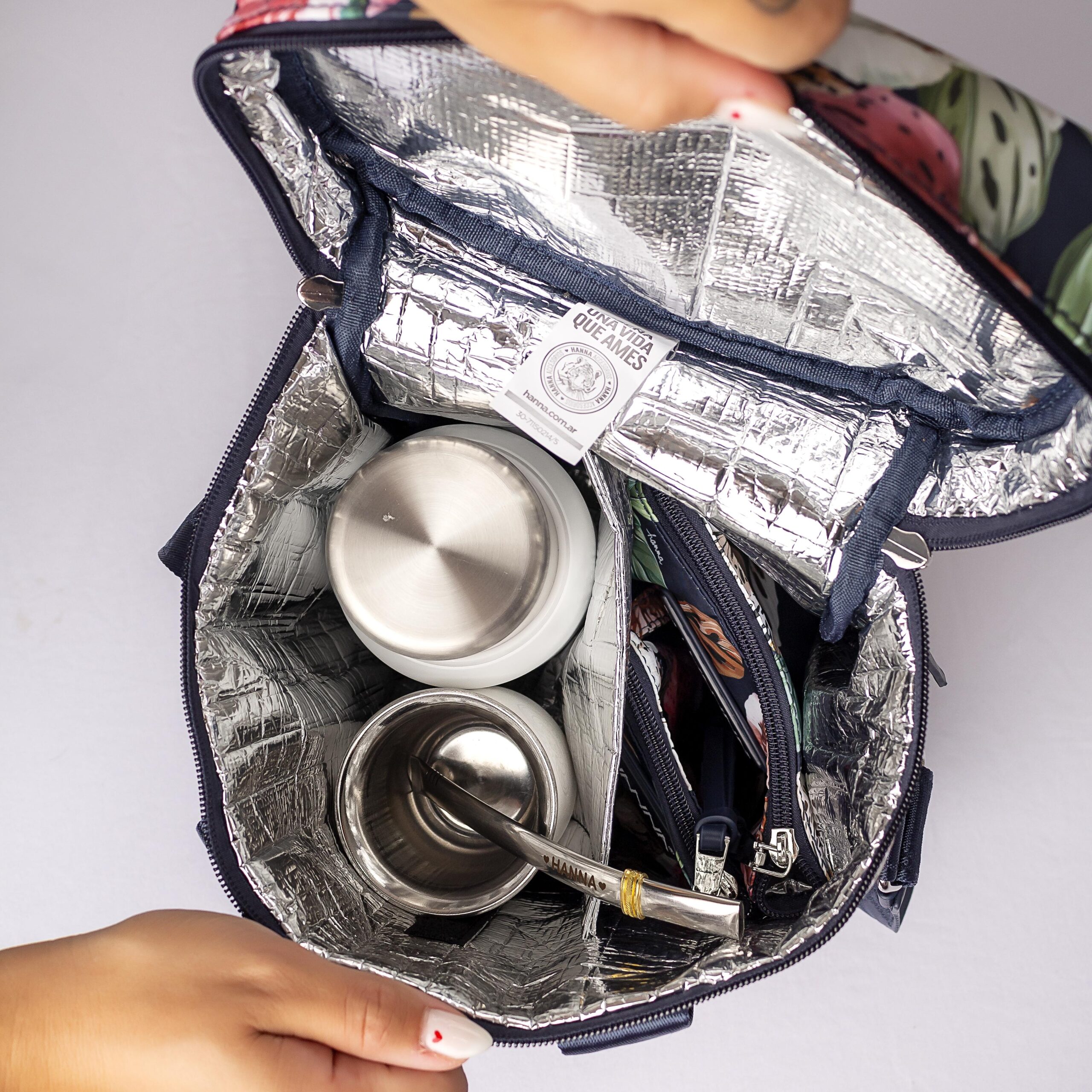 • Matera Luchy: interior térmico que mantiene frío y calor. Su separador interior desmontable sostiene el termo y al retirarlo se convierte en una heladera térmica portátil. Capacidad amplia: entra termo Stanley, mate, yerbera y azucarera. Puede llevarse colgada en el hombro, cruzada o en la mano.